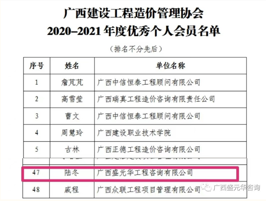 | 【喜訊】熱烈祝賀廣西盛元華獲評(píng)廣西建設(shè)工程造價(jià)管理協(xié)會(huì)“2020-2021年度先進(jìn)單位會(huì)員、優(yōu)秀個(gè)人會(huì)員”兩項(xiàng)榮譽(yù)稱(chēng)號(hào) |