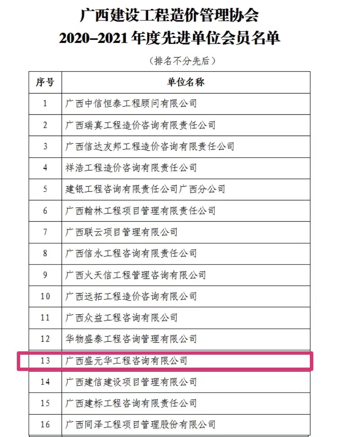 據(jù)悉,廣西盛元華至2019年以來(lái)蟬聯(lián)獲得廣西建設(shè)工程造價(jià)管理協(xié)會(huì)的先進(jìn)單位會(huì)員,這不僅是行業(yè)協(xié)會(huì)和社會(huì)各界對(duì)廣西盛元華篤行不怠,砥礪奮進(jìn)為廣大客戶提供高品質(zhì)服務(wù)的肯定,更激勵(lì)了每一位盛元華人以“誠(chéng)信為本 有諾必踐”為宗旨,在未來(lái)的工作中不斷提高服務(wù)品質(zhì),提高行業(yè)競(jìng)爭(zhēng)力而不懈努力!
