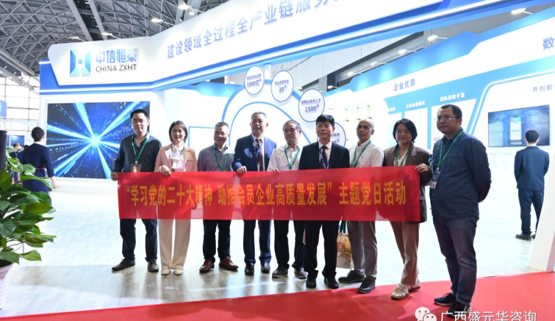 公司領(lǐng)導(dǎo)及公司黨支部成員與廣西建設(shè)工程造價(jià)協(xié)會(huì)黨支部在觀展期間進(jìn)行了黨建活動(dòng)交流并集體合影