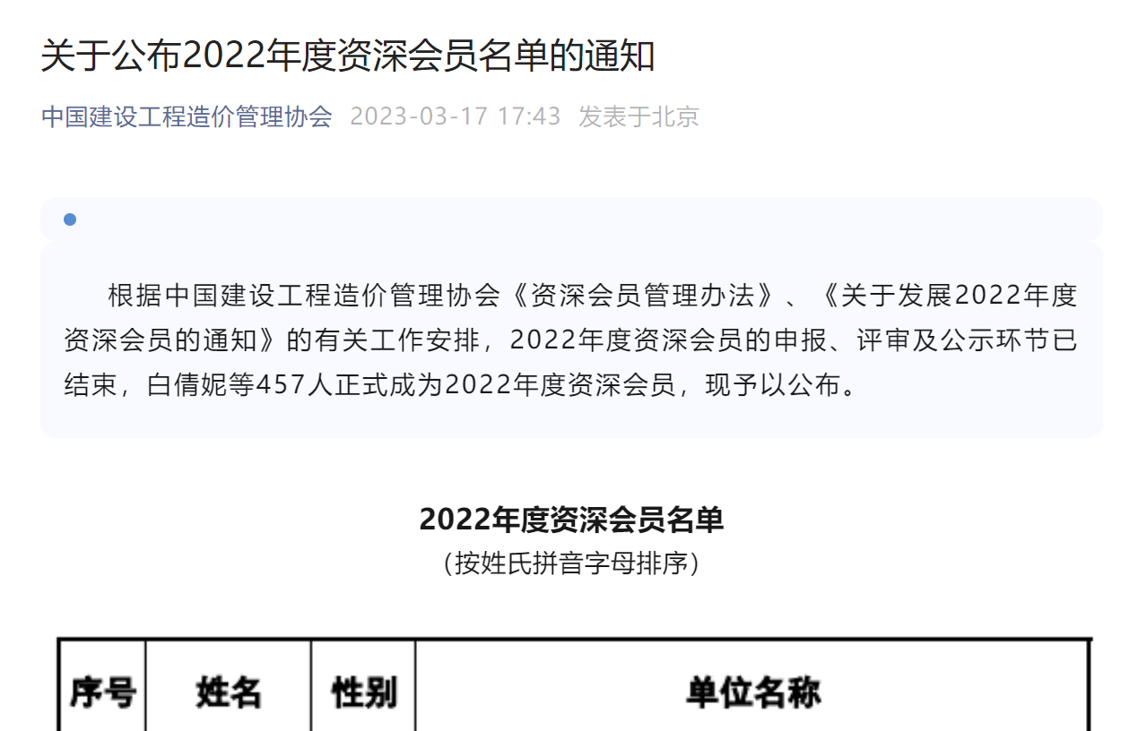 根據(jù)中國(guó)建設(shè)工程造價(jià)管理協(xié)會(huì)《資深會(huì)員管理辦法》、《關(guān)于發(fā)展2022年度資深會(huì)員的通知》的有關(guān)工作安排,2022年度資深會(huì)員的申報(bào)、評(píng)審及公示環(huán)節(jié)已結(jié)束,在公布的名單中,我集團(tuán)副總經(jīng)理陸冬、總經(jīng)理助理謝宇翔正式成為中國(guó)建設(shè)工程造價(jià)管理協(xié)會(huì)資深會(huì)員。
